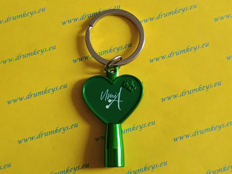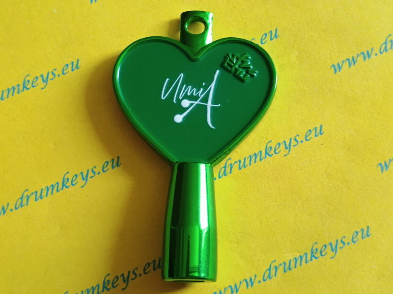 square key; heart-shaped key; green finish key with white Akane Umino logo;